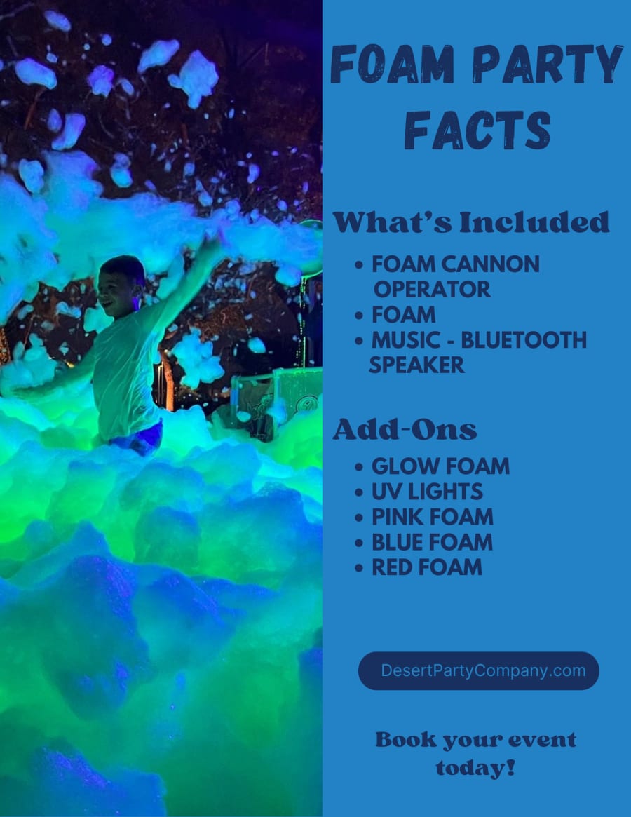 Our professional foam operator will set up the foam cannon at your desired location in the Coachella Valley. Once everything is in place, the foam cannon will start creating a thick, fluffy foam that will cover the dance floor or designated area. The foam is non-toxic, hypoallergenic, and easy to clean up, ensuring a safe and enjoyable experience for everyone. ππΆ