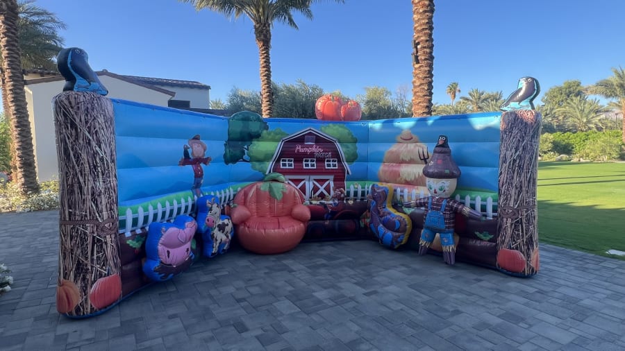 Bring autumn magic to any event with the Fall Fest Photo Op. This inflatable backdrop transforms patios, parties, and public events into a Fall themed photo destination. Bright pumpkins, a friendly scarecrow, a cozy pumpkin chair, and playful farm animals create a warm, festive scene that invites guests to stop, smile, and share. Perfect for family photos, corporate fall festivals, school events, and farmers market activations in Palm Springs and The Coachella Valley. 🍂🎃📸