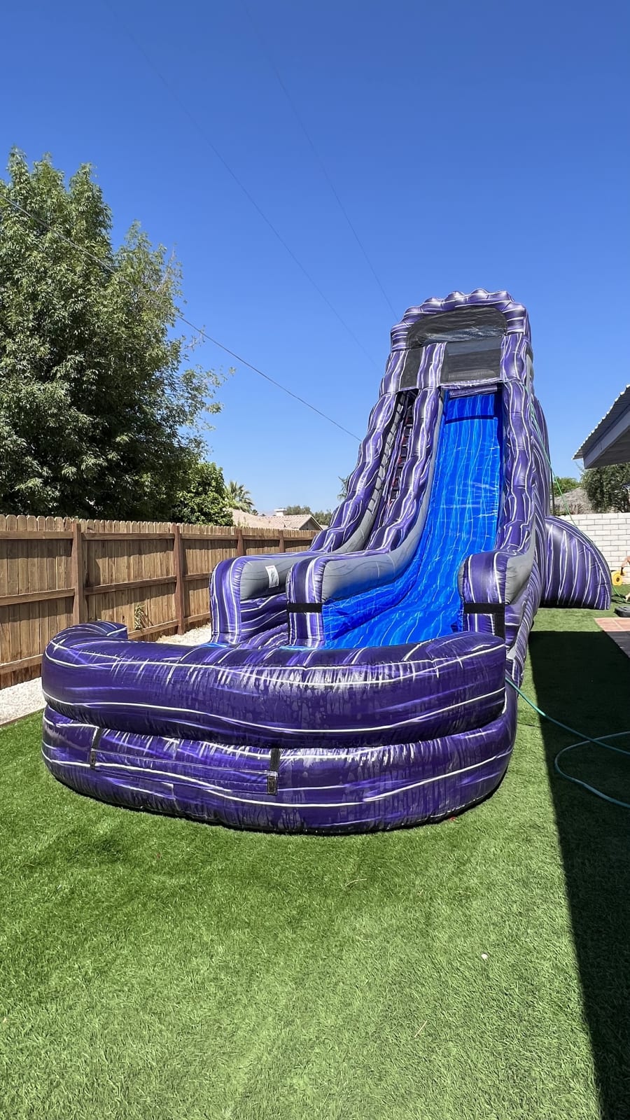 With its vibrant purple color and massive size, this waterslide is sure to be the centerpiece of any party or gathering. The large pool area at the bottom provides a refreshing landing spot for thrill-seekers looking to cool off on a hot day. 🏊♂️💦